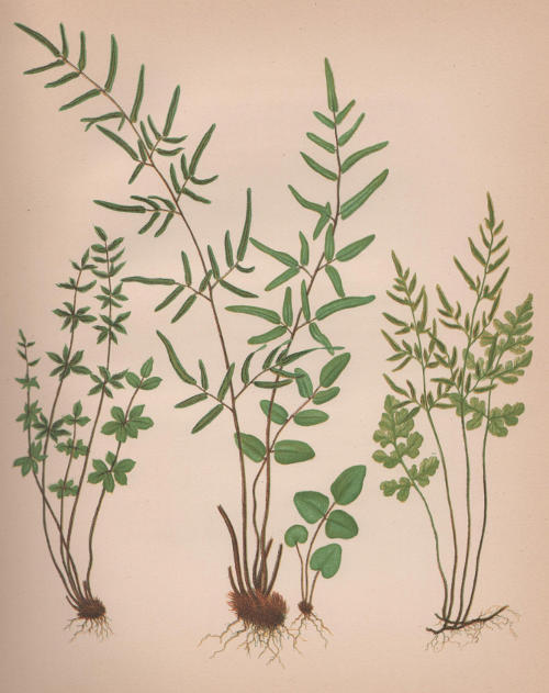 The fronds are developed late in the Spring, and remain green through the next Winter. They are almost coriaceous in texture, smooth and dark-bluish-green above, paler, and sometimes slightly chaffy beneath. They are from a few inches to about a foot in length, and vary in outline from ovate to oblong-lanceolate. In seedling plants the earliest fronds are round-cordate, the next cordate-ovate, and then follow trifoliate, pinnate, and finally mature bipinnate fronds. The largest fronds have about five pairs of compound pinnæ, each with from three to eleven pinnules, and above these are from four to six pairs of simple pinnæ, besides the terminal one, which is often the longest of all.