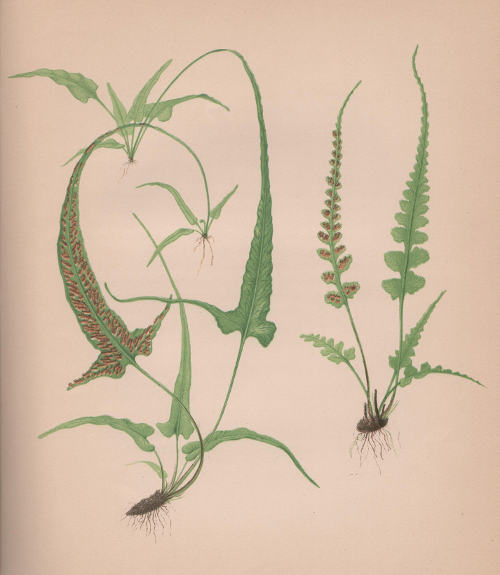 The wings of the stalk widen out into a wedge-shaped base, which is sunken in a sinus between two basal auricles of the [097] frond. These auricles are scantily developed in small fronds; but in larger ones they are more or less prominent, making the base of the frond either cordate or hastate. In specimens from Cheshire, Connecticut, and in some from Indiana, the auricles are drawn out into slender points, in one instance fully four inches long. The fronds are deep-green in color, and sub-coriaceous in texture. The fronds of mature plants are from six to twelve, or even fifteen, inches long; and their greatest width, measured just above the auricles, is about one-twelfth of the length, or from six to fifteen lines. The midrib is a little paler than the rest of the frond, and is rather prominent on the under surface. The margin of the frond is gently undulating or entire, rarely incised.[2] The upper part of the frond is scarcely wider than the stalk, and commonly produces a proliferous bud at the apex, where it very frequently takes root, and develops a new plant. In this way a single plant in a favorable position will become a whole colony in a few years’ time.