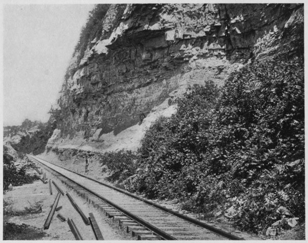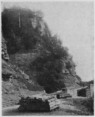 Fortunately, the construction of the railroad along the face of the eastern wall of the gorge affords opportunity to study the rate of erosion during a definite period of time. The accompanying photogravures will illustrate to the eye facts which it is hard to make impressive by words alone. The course of the road is diagonally down the face of the gorge from its summit for a distance of about two miles, descending in that space about two hundred feet to the outcrop of hard quartzose Medina sandstone. The lower mile of this exposure presents the typical situation for making an estimate of the rate at which the face is crumbling away.