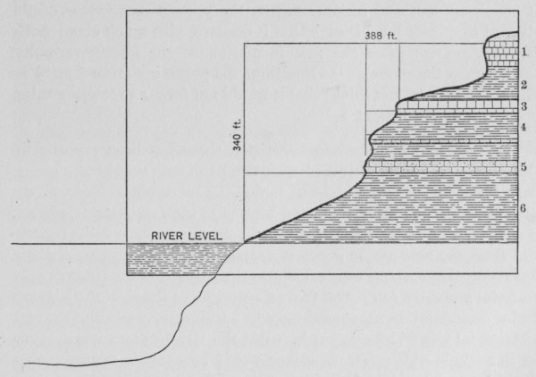 The face on the east side of the gorge presents a series of alternate layers of hard and soft rocks, of which certain portions are very susceptible to the disintegrating agencies of the atmosphere. The summit consists of from twenty to thirty feet of compact Niagara limestone, which is underlaid by about seventy feet of Niagara shale; which in turn rests upon a compact stratum of Clinton limestone[Pg 149] about twenty feet thick, which again is underlaid by a shaly deposit of seventy feet, resting upon a compact stratum of Medina sandstone twenty feet thick, below which a softer sandstone, that crumbles somewhat readily, extends to the level of the river.