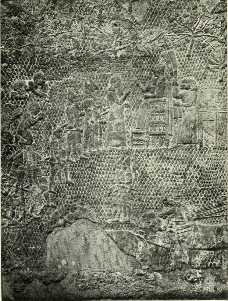 It is not until the reign of Assur-nazir-pal III (c. 883 B.C.) that we are once more enabled to take up the thread of Assyrian history with any degree of certainty. In this reign artistic development appears to have proceeded apace; but it cannot be said of Assur-nazir-pal that in him culture went hand[Pg 24] in hand with humanity, the records of his cruelties being long and revolting. His successor, Shalmaneser II, possessed an insatiable thirst for military glory, and during his reign of thirty-five years overthrew a great confederacy of Syrian chiefs which included Ahab, King of Israel. He was disturbed during the latter part of his reign by the rebellion of his eldest son. But his second son, Samsi-Rammon, came to his father's assistance, and his faithful adherence secured him the succession to the throne in 824 B.C.
