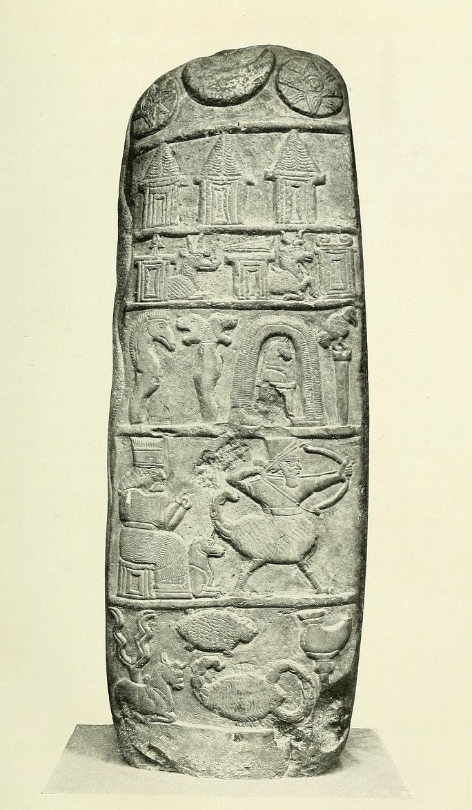 But the first great Semitic empire in Babylonia was that founded by the famous Sargon of Akkad. As is the case with many popular heroes and monarchs whose deeds are remembered in song and story—for example, Perseus, Œdipus, Cyrus, Romulus, and our own King Arthur—the early years of Sargon were passed in obscurity. Sargon is, in fact, one of the 'fatal children.' He was, legend stated, born in concealment and sent adrift, like Moses, in an ark[Pg 17] of bulrushes on the waters of the Euphrates, whence he was rescued and brought up by one Akki, a husbandman. But the time of his recognition at length arrived, and he received the crown of Babylonia. His foreign conquests were extensive. On four successive occasions he invaded Syria and Palestine, which he succeeded in welding into a single empire with Babylonia. Pressing his victories to the margin of the Mediterranean, he erected upon its shores statues of himself as an earnest of his conquests. He also overcame Elam and northern Mesopotamia and quelled a rebellion of some magnitude in his own dominions. His son, Naram-Sin, claimed for himself the title of "King of the Four Zones," and enlarged the empire left him by his father, penetrating even into Arabia. A monument unearthed by J. de Morgan at Susa depicts him triumphing over the conquered Elamites. He is seen passing his spear through the prostrate body of a warrior whose hands are upraised as if pleading for quarter. His head-dress is ornamented with the horns emblematic of divinity, for the early Babylonian kings were the direct vicegerents of the gods on earth.