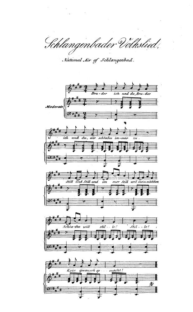 It was a cavern or cavity in the rock, with three fissures or embrasures radiating at a small angle; yet each looking down upon the Rhine, which, pent within its narrow rocky channel, was, at a great depth, struggling immediately beneath us. The sudden burst into daylight, and the brightness of the gay, sunshiny scenes which through the three rude windows had come so suddenly to view (for I really did not know that I was on the brink of the precipice of the Rhine), was exceedingly enchanting, and I was most fully enjoying it as well as the reflection, that there was no one to interrupt me when I suddenly fancied that I certainly heard, somewhere or other within the bowels of the living rock in which I was embedded, a faint sound, like the melody of female voices, which, in marked measure, seemed to swell stronger, until I decidedly and plainly heard them, in full chorus, chanting the following well-known national air of this country:—(See “the Schlangenbader Volkslied,” National Air of Schlangenbad, at the end of the volume.)