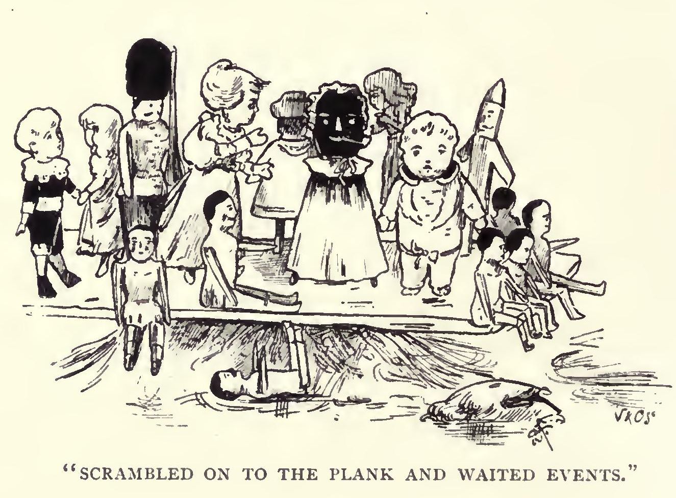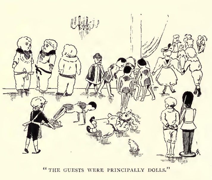 “I am not quite certain,” replied Pierrot; “but in this case I think it must mean Ridiculous Society and Violent Papa. You see, being a toy wedding, they are obliged by toy etiquette to ask all the articles on the same shelf as the bride and bridegroom, and so the company is bound to be rather mixed, and the bride’s father is afflicted with the most violent temper you have ever heard of.”