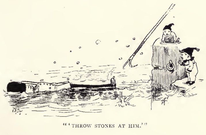 When he at last reached the bottom one, he was greatly disappointed to find that there was nobody in sight. From behind a piece of rock, however, half buried in the sand, came the sound of laughter. “Ha, ha, ha! Hee, hee, hee! Ho, ho!” shouted somebody, and when Boy hurried up to where the sounds proceeded from a curious sight met his eyes.