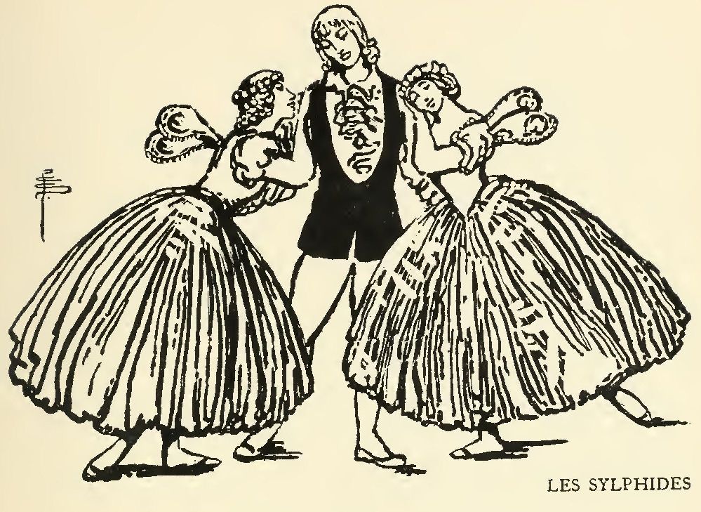 Perhaps the rhythm of the music has never been better perceived than through these well-ordered movements designed by Fokine. The appearance of Nijinsky as a kind of dream Alfred de Musset in a romantic fair wig, and dressed in black and white, among the impalpable Sylphides was both inexplicable and inevitable. When he danced he seemed almost to play Chopin with his feet, so perfect was his time. His steps seemed to be the symmetry of the music—in fact its rhythm, for the rhythm of music is symmetry in motion. And when he merely walked about with outstretched arm, he recalled Ruskin's allusion to man "in erect and thoughtful motion," to "the great human noblesse of walking on feet."