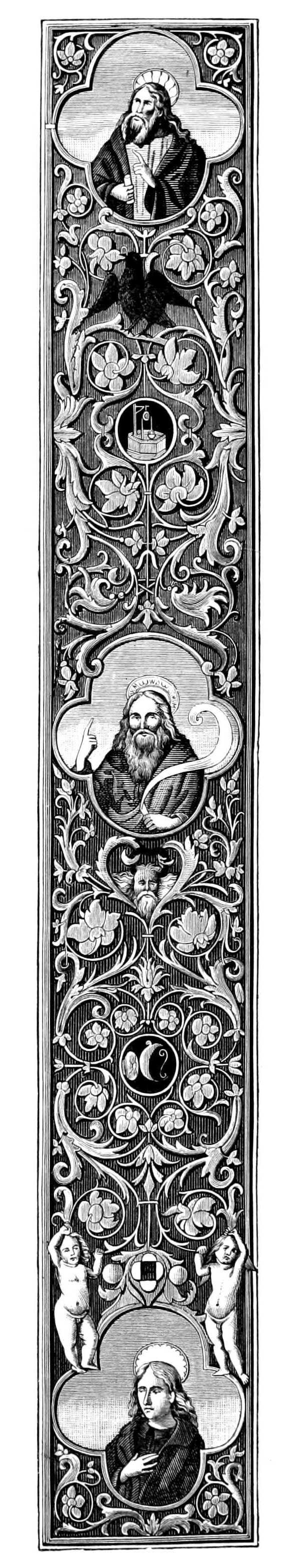 The Irish Church; Celtic goldsmiths; technical processes of the metal-workers copied by illuminators of manuscripts; the Book of Kells, its perfect workmanship and microscopic illuminations; copies of metal spiral patterns; the "trumpet pattern;" Moslem influence; absence of gold in the Irish manuscripts; the Book of Durrow; the monks of Iona; the Celtic missionaries to Northumbria; the Gospels of St Cuthbert; the Viking pirates; the adventures of St Cuthbert's Gospels; the Anglo-Celtic school; improved drawing and use of gold; Italian influence; the early Gospels in the Corpus library; the Gospels of MacDurnan; the Book of Deer; the Gospels of St Chad; the Celtic school on the Continent; the Psalter of St Augustine; Scandinavian art; the golden Gospels of Stockholm and its adventures; the struggle between the Celtic and the Roman Church; the Synod of Whitby; the Roman victory, and the growth of Italian influence; the school of Baeda at Durham.