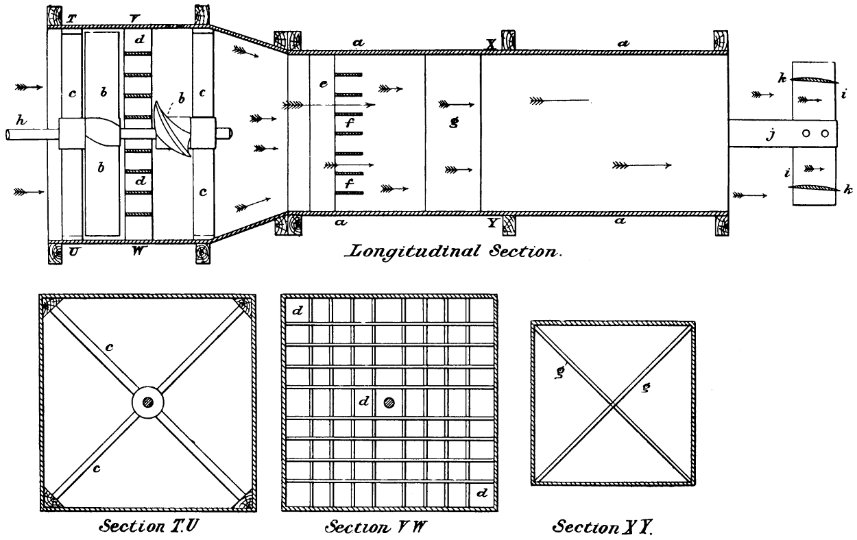 My father’s proposed machine, of which he made a sketch, was of the Hélicoptère type, having two screws both on the same axis—the lower one to be right hand and mounted on a tubular shaft, and the top one to be left hand and mounted on a solid shaft running through the lower tubular shaft. These screws were to be rotated in reverse directions by means of a small pinion engaging a bevel gear attached to each of the shafts. His plan contemplated large screws with very fine pitch, and he proposed to obtain horizontal motion by inclining the axis forward. He admitted that there was no motor in existence light enough, but thought one might be invented, and that an engine might be worked by a series of explosions in the cylinder, that is, what is known to-day as internal combustion; but he was not clear how such an engine could be produced. He, however, said that a flying machine would be so valuable in time of war, that it mattered little how expensive the explosive might be, even if fulminate of mercury had to be used. It is interesting to note in this connection that the great Peter Cooper of New York thought out an identical machine about the same time, and actually commenced experiments. It seems that this gentleman regarded fulminate of mercury[vi] as altogether too feeble and inert, because we find that he selected chloride of nitrogen as his explosive agent. However, his work was soon brought to an end by the loss of the sight of one eye, after which time he had no further dealings with this lively explosive.