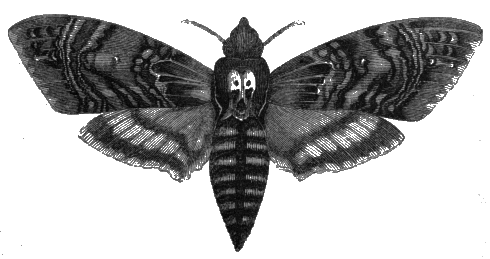 Sometimes insects are the innocent causes of alarm even to nations. Thus there is a peculiar kind of moth, upon the back of which there is very distinctly marked the appearance of what is vulgarly called a "death's head," its name being the death's-head hawk moth, represented in the adjoining cut, which was once the cause of the [6] greatest terror to a number of persons. It was in Bretagne that a large flight of them suddenly made their appearance; at the same time a dangerous epidemic disease fell upon the inhabitants; the awful look of the poor insect, together with its strange supernatural noise, filled the ignorant people with alarm, and the disease was considered to be actually caused by the moths. Another insect, the church-yard beetle, which is of a jet black colour, is related by the great Linnæus as producing the most alarming feelings upon the minds of the superstitious and ignorant among the peasantry of Sweden.
