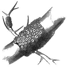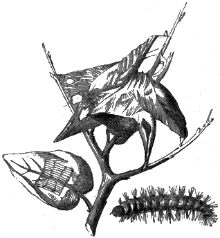 Here might we point to him that wondrous and exquisite structure, the life-boat of eggs, floating[A] securely on its silent surface, or anchored, perhaps, to the side of some pond-plant's slimy stem; and lingering here we might in a few days see the little eggs become burst and give exit to a number of minute creatures of great activity. Some of them would be seen twisting themselves about in a most extraordinary manner, and swimming here and there through the still waters. Or we might take him to the depths of the forest, and now, under the bark of some of the trees, now upon their branches, [10] now in little tents of leaves, we could point out many a colony of eggs only waiting for the life-giving influence of spring to burst into life and activity.