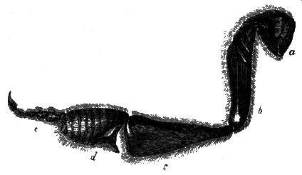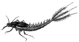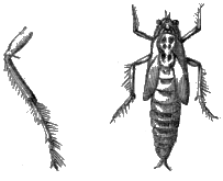 Among the wingless insects of Linnæus, is one which he has called by a name which signifies that it has got a leg in its tail; and this is actually the fact, in so far as that these insects have an organ in their tail, which answers all the purpose of a leg. Some of these little creatures, which are black, may be often found in spring strewed in infinite numbers upon the surface of the water in ditches or pools; and may be seen jumping about on the surface of the water as if bewitched. At their tail is a fork-like organ, which is generally bent under the body; but [397] when they spring up they do so by quickly unbending this fork, the resistance it meets with being sufficient to carry it to a certain distance. Another insect is provided with eight pair of springs in its abdomen; by means of which it can leap to a great distance with most astonishing agility. Here we shall conclude the external anatomy of the insect, in the imago state.