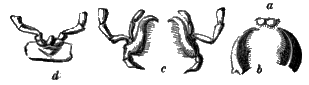 The mandibles, (b) or upper jaws, in the biting insects, are instruments for cutting the food in pieces. When we bite our food, the movement of our jaw is upwards and downwards; but in the insect it is like that of a pair of scissors, or from side to side! These jaws are sometimes frightful-looking instruments, resembling, in the stag-beetle, horns; and their power is proportionally great. Although their general use is to masticate or crush the food for the insect, this apparatus is often employed as a formidable weapon of [372] defence, or offence; and very frequently in the excavation of a nest or retreat for the insect. They are sometimes so constructed, as to look as if they were furnished with several teeth.
