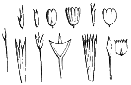 The natural number of wings in the insect world is four, arranged in two pairs. But this number is obscured by the modifications to which in many instances one or other of the pairs becomes subject; and we should, if this were not remembered, become somewhat confused at taking up the first insect that came in our way, which would probably be the common fly, and finding that we could only recognise two large wings instead of four. In this tribe of insects the hinder pair of wings is reduced to a pair of slender knobbed filaments. Some insects are without wings at all. The ant, the bee, the dragon-fly, the house-fly, and many other insects, are furnished with wings of gauze-like transparency and structure, often crossed in a curious manner by the nervures, of which we before had occasion to speak. These wings are called membranaceous. In the moth and butterfly tribes the wings are covered with what appears to be a delicate, beautiful powder, but is in reality a multitude [379] of exquisite scales, of the singular forms represented. The engraving shows the shape of the scales on the wings of these insects; on examination with a good lens, it appears that the long and hair-like scales are planted at the margin of the wings, and contribute to give to the edges that beautiful feathery look which is so much admired, while the short scales were placed principally on the middle portion of the wings; their numbers are almost infinite. If a butterfly is allowed to flutter awhile in a box it will cover every portion of its surface with them, and yet, on being permitted to fly out, we may scarcely perceive that it has lost any of its fairy plumes. Whether Leuwenhoek actually took the trouble to count so many, or arrived at the result from calculation after counting those on a given space, we do not know, but he declares that he found more than four hundred thousand on the wings of the silk-worm moth; and in those of larger [380] moths and butterflies the number must greatly exceed this. They are generally arranged like the tiles on a house-roof; and if they are scraped off, the minute dots where each was attached becomes distinctly visible. The term used to indicate the tribe of insects to which the moth and butterfly appertain, is, as has been before remarked, Lepidoptera, or "scale-winged," from this very fact. Some membranaceous wings are clothed with fine hairs.