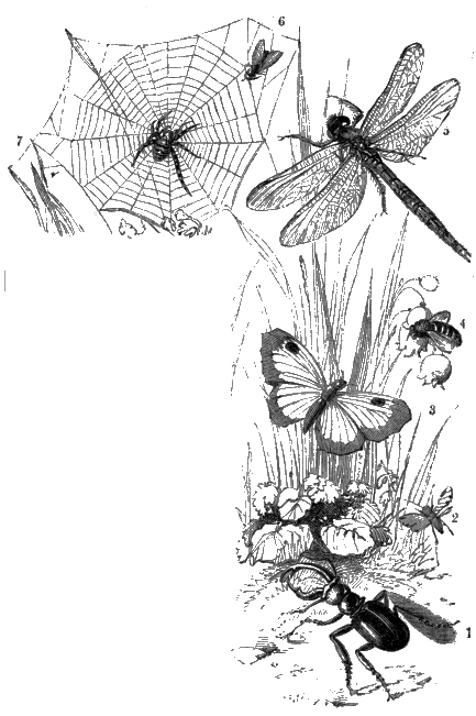 In the opposite cut the insects represented illustrate each of the Linnæan orders. They are—1. a Beetle; 2. an Aphis; 3. a Butterfly; 4. a Bee; 5. a Dragon-fly; 6. a House-fly; and, 7. a Spider.