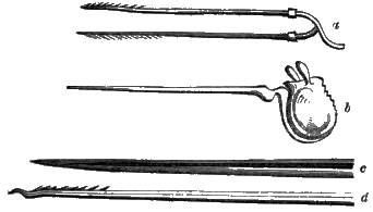 a, represents the pair of darts; d, a single dart; b, the poison-bag; and c, the sheath.