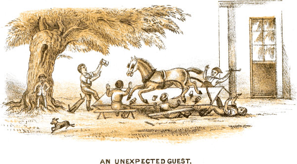 On one occasion I was coming away from a change at D——d, when, at the signal to go, she jumped from the middle of the road completely through the bay-window of a tailor’s shop, where several men were occupied on the board. At another time she was put to at S——n, where, the weather being oppressively hot, a party of yokels were regaling al fresco round a large table under the trees. Their[Pg 19] attention was naturally attracted to the coach during the change of horses, but little did they dream that in another minute one of the leaders would be on the table before them. So, however, it was. With one bound, scattering the pipes and pewters far and wide, she landed in the middle of the board.