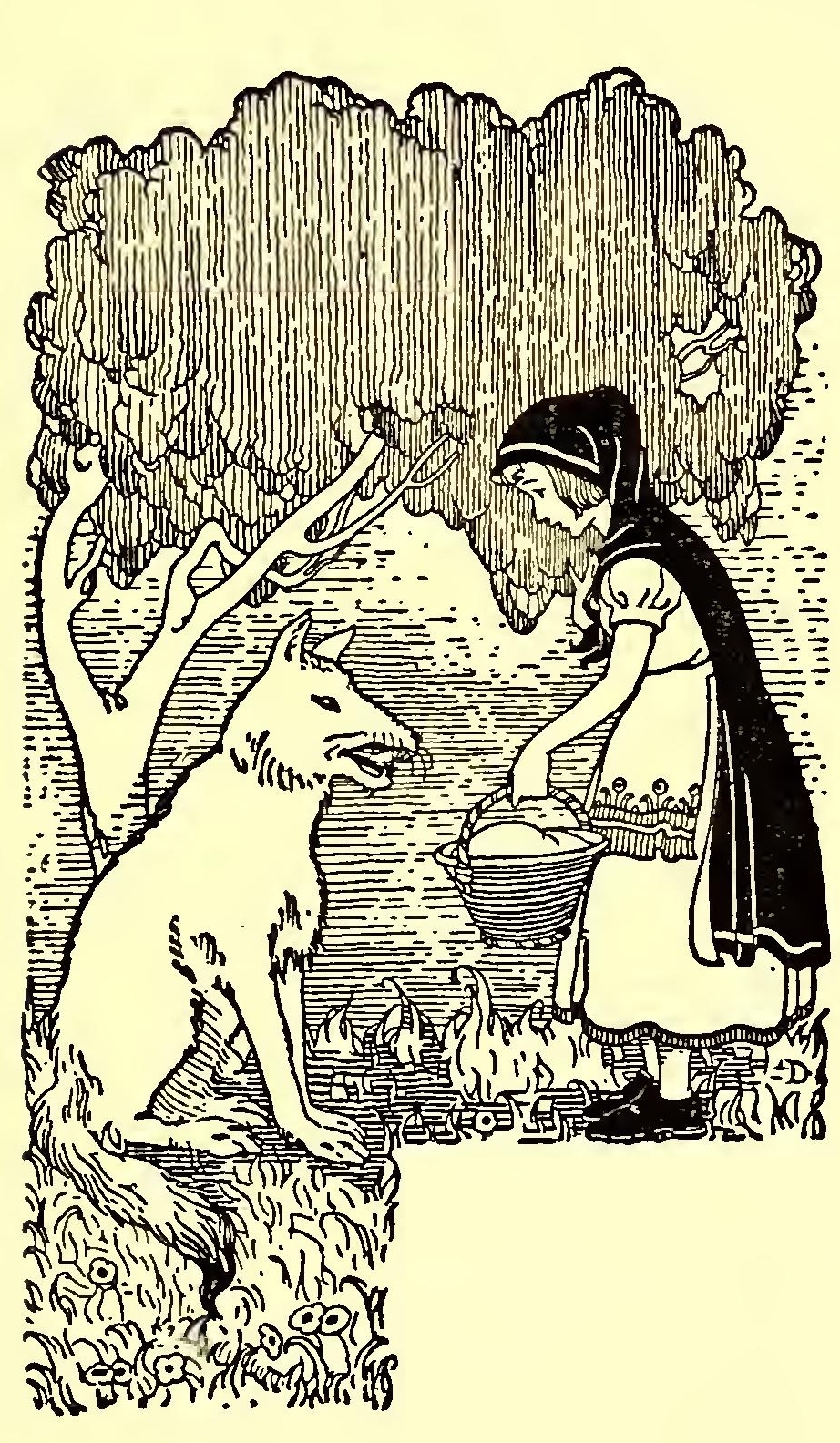 “Little Red-Riding-Hood. I have brought you a cake and a pot of butter from mother.” The Wolf softened his voice as much as he could, and called out:—