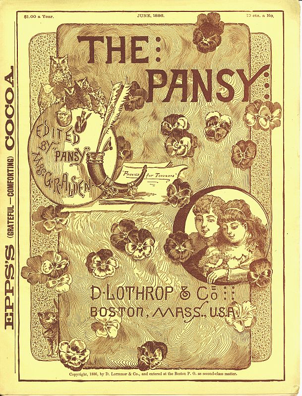 $2.00 will pay for The Pansy for one year from Nov., 1885 (or current issue, if preferred), and the 12 numbers for 1885 bound in a handsome cloth cover, thereby saving 75 cents.