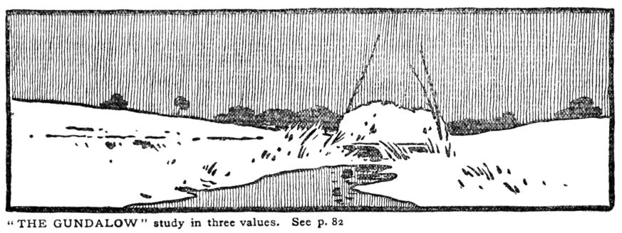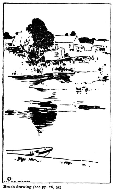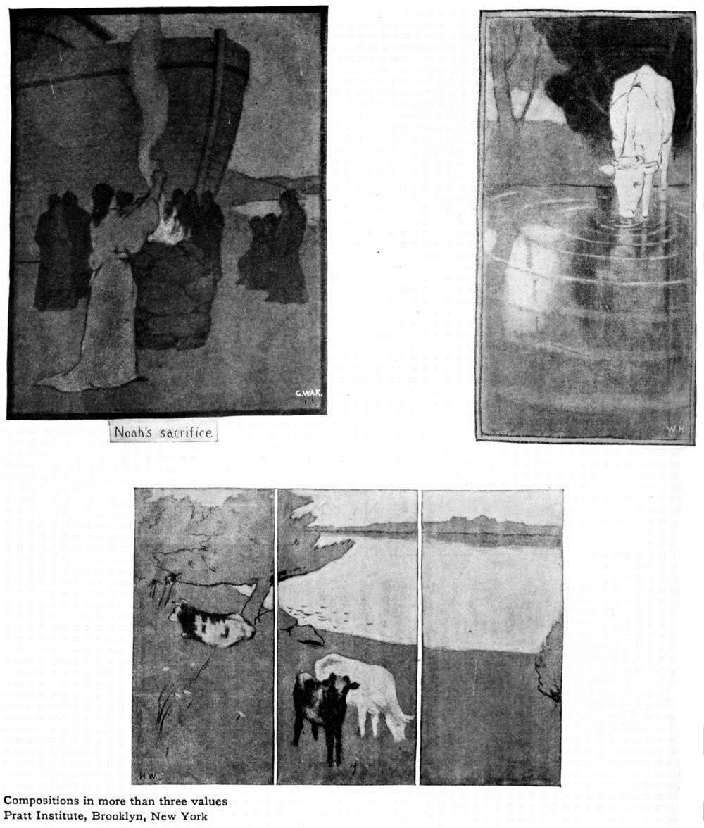 COLORED CHARCOAL. This is a further development of the method described in Chapter XIII (see also page 113). Lay in the picture in light values of charcoal, remembering that the colorwashes will darken every tone. Too much rubbing with the stump gives muddiness, too little charcoal may weaken the values and you will have a “washout.” When the notan-scheme is right, the drawing may be fixed. It can be colored without fixing if the stump has been used.