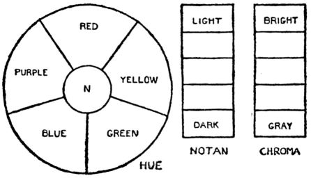 Science determined long since that the fundamental color impressions are not red, blue and yellow, but Red, Green and Violet-blue. Mr. Munsell adopts these and two secondaries, Yellow and Purple—five hues in all—as the basis of all color expression in art. This seems very simple and quite sufficient for working out all problems in color scheming. Note. Experiments as outlined below, are intended only to set the student thinking, in an orderly way, about the three dimensions of color.
