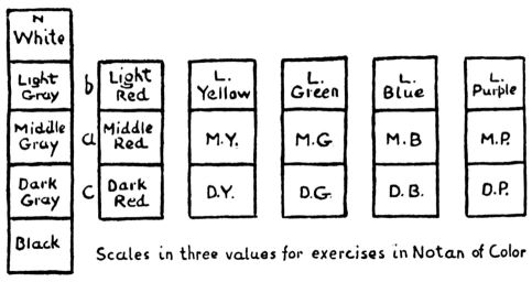 NOTAN of COLOR. Draw in outline six scales, as shown in the diagram. Paint N in white, black and three grays (see page 88). In the spaces marked (a) paint each of the five hues—red, yellow, green, blue and purple, middle value and equal intensity.
