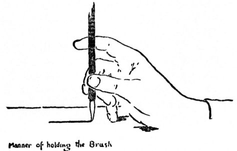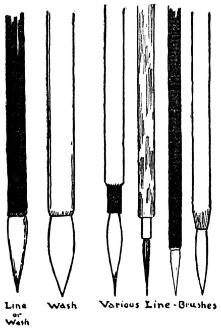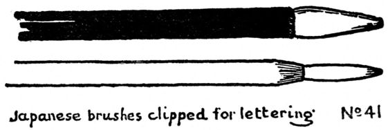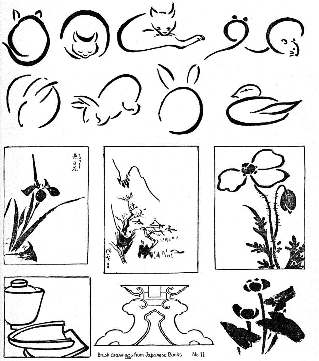 [pg 10] [pg 11] [pg 12] [pg 13]Japanese brushes, ink and paper are to be preferred for exercises in line drawing, tracing, notan massing and washes in grays. Long brushes are best for long continuous lines, short brushes for sharp corners and broken lines. For lettering, clip the point of a long line-brush, (see p. 55)