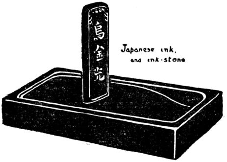 Japanese ink must be ground upon the ink-stone, a slab of slate. Intense blackness can be secured immediately by using only a few drops of water. Dry the ink stick, and wrap in paper; never leave it soaking. Ink of good quality, and a clean stone are essential. Tools perfected by ages of practice in line drawing and brush work, afford the best training for hand and eye. Painting with the Japanese brush leads directly to oil painting. If Japanese materials are not to be obtained or are not desired, the exercises can be carried on with pencil, charcoal, water colors, crayons, and even oil paint.