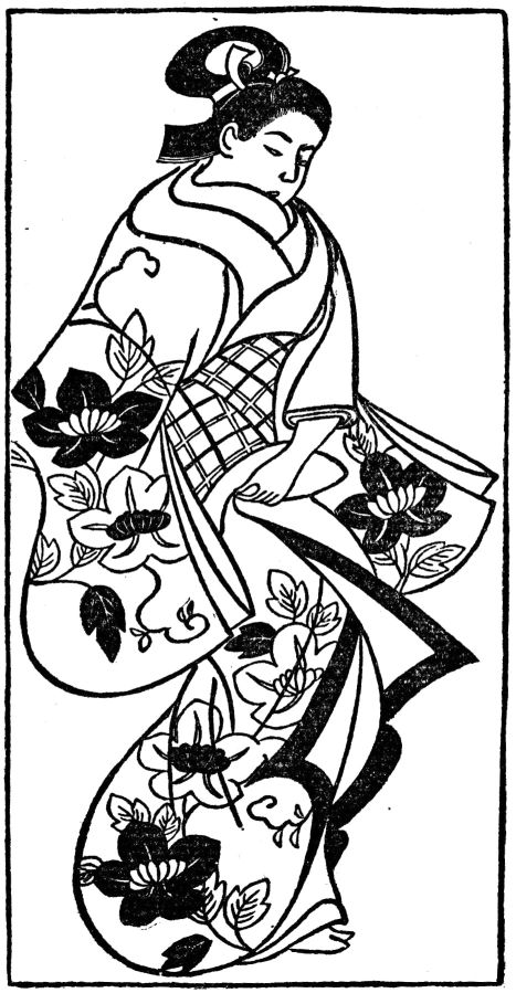 Torii Kiyonobu and his fellows of the “red-and-green period” (first half of the XVIIIth century); Harunobu, Koriusai, Kiyonaga and Shunsho, who worked in sunny yellows and reds, pearly greens and pale purples, often most cleverly opposed with transparent black and cool silvery grays; then Utamaro and Toyokuni I., strong but less fine.