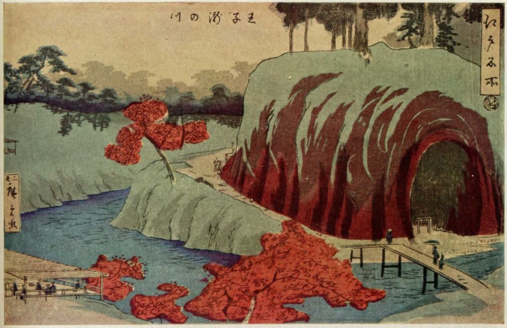 The figure prints most commonly seen are by Kunisada (Toyokuni II), Kuniyoshi and other pupils of Toyokuni I., and Keisai Yeisen. Here, as in most Japanese figure prints, color effects are produced by skilful combinations of patterns upon costumes. Every kind of color-key is possible, by this means, with infinite variations;—impressionist painting with wood blocks. The student is warned that poor prints abound,—impressions from worn-out blocks, cheap modern reprints, and imitations. Bright, fresh color, however, need not be taken to mean imitation; some of the early editions have been kept in albums in store houses, and the color has not changed. Experience and appreciation are after all the only safeguards.