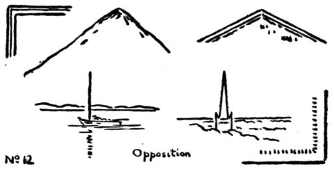 1. OPPOSITION. Two lines meeting form a simple and severe harmony. [pg 22] Examples will be found in Greek door-ways, Egyptian temples and early Renaissance architecture; in plaid design; also in landscape where vertical lines cut the horizon (see pp. 21, 45, 46.) This principle is used in the straight line work in squares and rectangles, pp. 32, 33, 39, and in combination with other principles, pp. 25, 29.