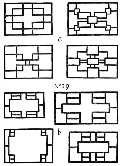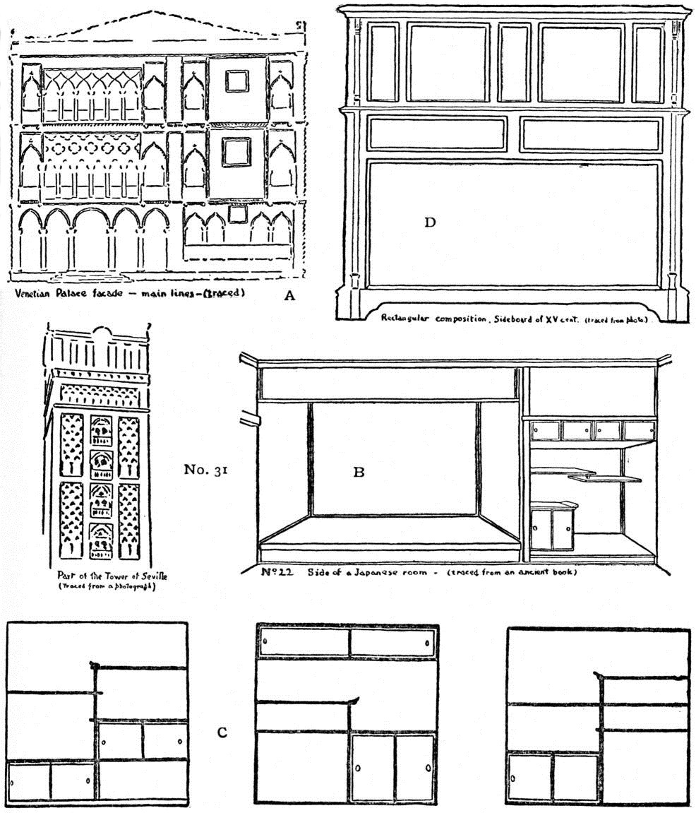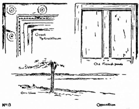 Opposition. Copy the sketches and illustrations, enlarged. Design straight-line arrangements of mouldings, plaids and rectangular panellings, Nos. 13, 18, 24. Find examples in nature, and draw in line, with brush, pen or pencil without a border.
