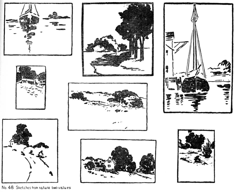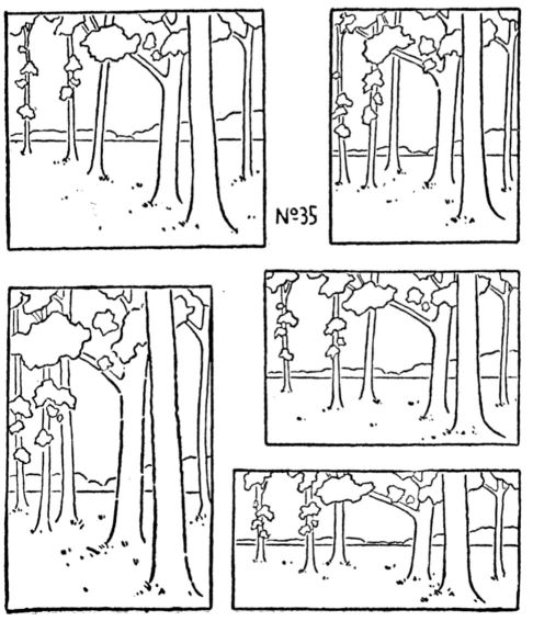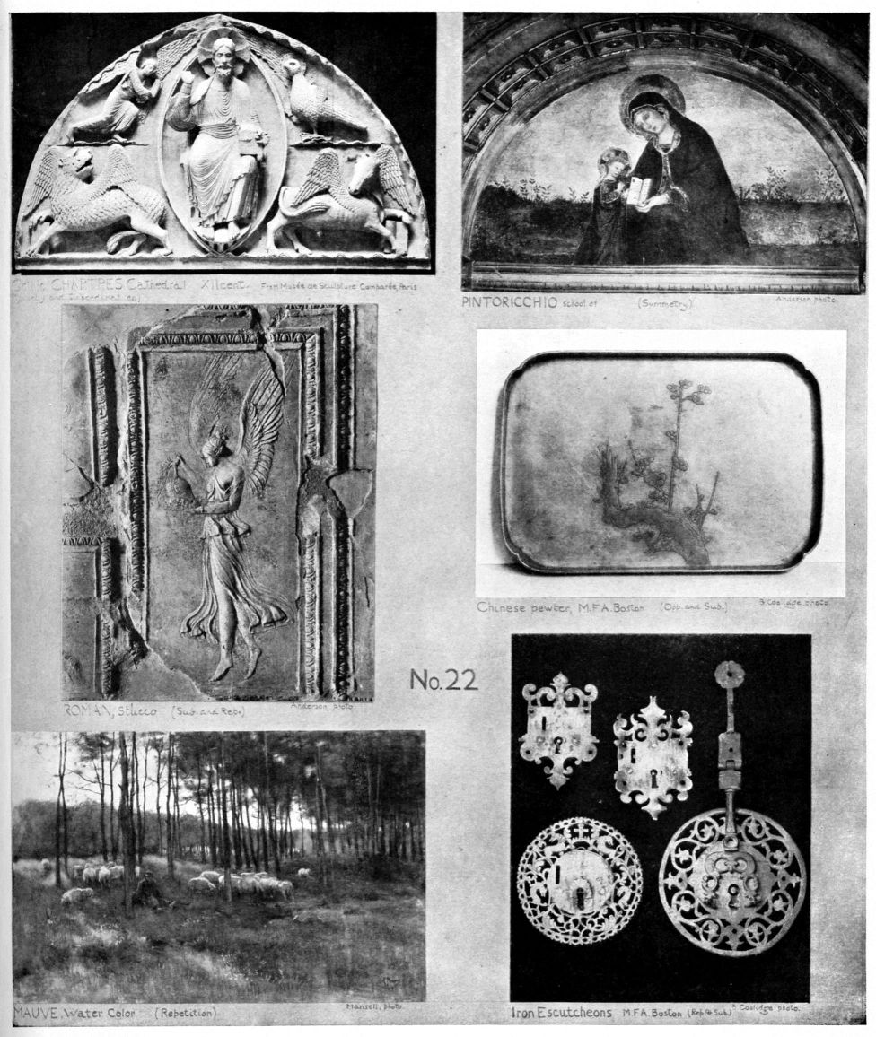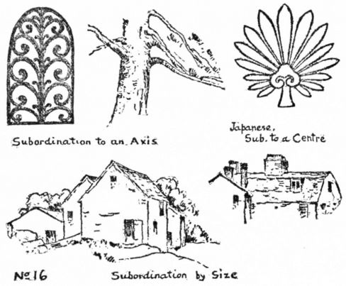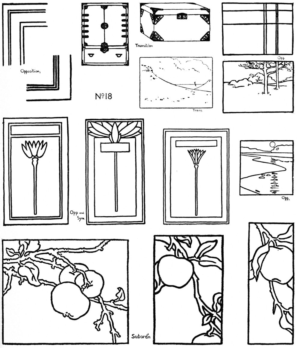 Art-interest in any of these lies in the fineness of relation. A throwing together of large and small; mere geometric radiation; or conventional branching can never be other than commonplace. A work of fine art constructed upon the principle of Subordination has all its parts related by delicate adjustments and balance of proportions, tone and color. A change in one member changes the whole. No. 22.
