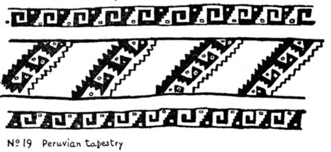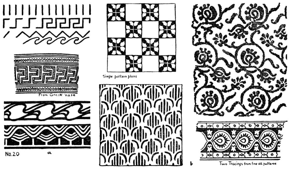 1. Borders. Divide a long space by vertical or oblique lines at regular intervals. By connecting the ends of these with straight lines, develope many series of meanders, frets and zigzags. Waves and scrolls are evolved from these by changing straight to curved line, No. 20a, and p. 56. 26
