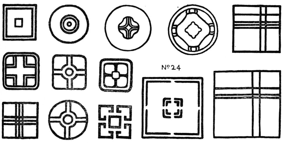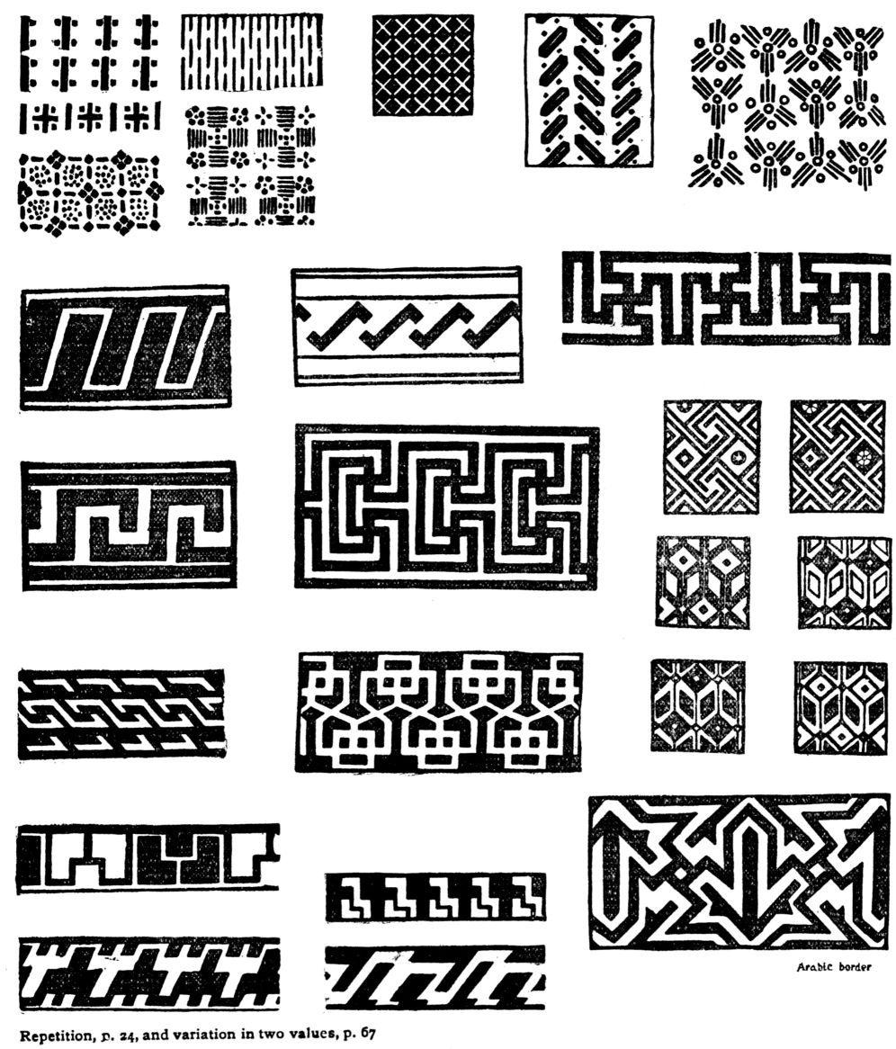 As soon as the unit is repeated a new set of relations will be created, dependent upon the spacing. A secondary pattern forms itself out of the background spaces. Hence the designer must decide whether the unit is to fill the skeleton square completely, have a wide margin, or overrun the square. Repeating the figure in these various ways will determine the best size. The main effort should be given to producing a fine relation between one unit and its neighbors and between pattern and background. All the best work in Repetition has this refined harmony of spacing. No. 20b below and pp. 13, 65, 66, 85. Copy the illustrations of Repetition in this book, and make original variations of them. Copy, in line, the units of early Italian textiles, Oriental rugs or any of the best examples to be found in museums or in illustrated art-books. See “Egg and Dart” from the Parthenon, p. 30, also pp. 67, 121. For anatomy and planning of pattern, see the works of Lewis F. Day.