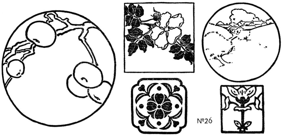 [pg 30] [pg 31] [pg 32]After working with the principles long enough to understand their nature, and to see what can be done with them, the student is ready for problems in composition. Practice in line arrangement is a preparation for all kinds of art work, be it design, painting, sculpture or architecture. Choose an enclosed area of definite and regular shape, and break it up into a harmonious group of smaller areas by drawing lines. For these elementary exercises in composition the square and circle are best because their boundaries are unchangeable, and attention must be fixed upon interior lines. Take first the square, using straight lines of equal thickness drawn with the brush as suggested in chapter II. The result should be a harmony of well-cut space, a little musical theme in straight lines and grouped areas. Make many trial arrangements, sketching lightly with charcoal on “bogus” or lining paper. Select the best, correct them, and draw with brush and ink over the charcoal lines. From these choose the most satisfactory, place thin Japanese paper over them and trace in firm black lines, freehand, with the Japanese brush. Avoid hard wiry lines and all that savors of rule and compass or laborious pains-taking. Use no measure [pg 34] of any kind; sizes, shapes and directions must be decided upon without mechanical aids.