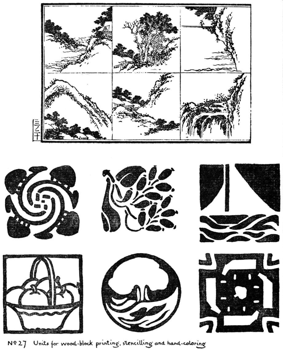 With the design in fixed form upon the block, effort can be concentrated upon the make-up of the pattern, and the color-harmony. By cutting a block for each color the designer may vary the schemes almost to infinity. Where choices are many and corrections easy, invention can have free play.