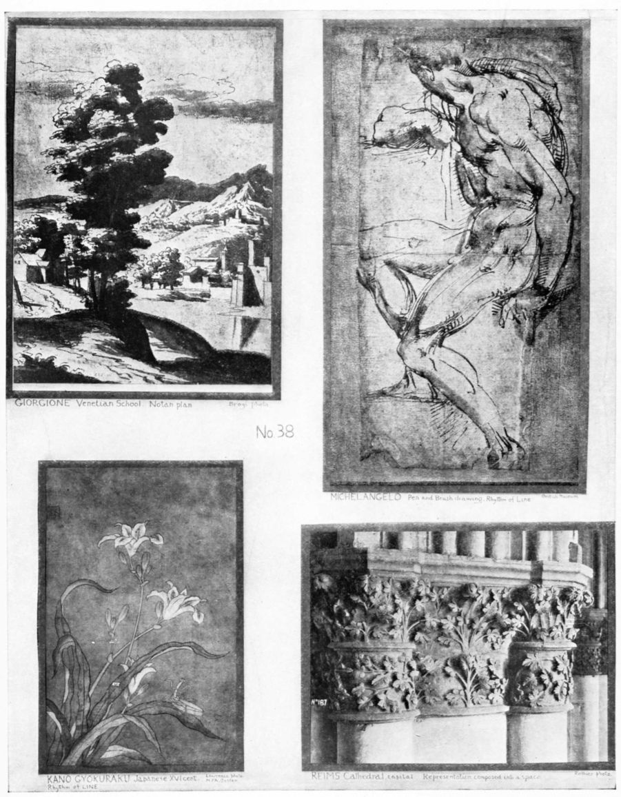 | 1. | LINE. The chief element of beauty in architecture, sculpture, metal work, etching, line design and line drawings. Nos. 1, 2, 3, 6, 23, 38. |