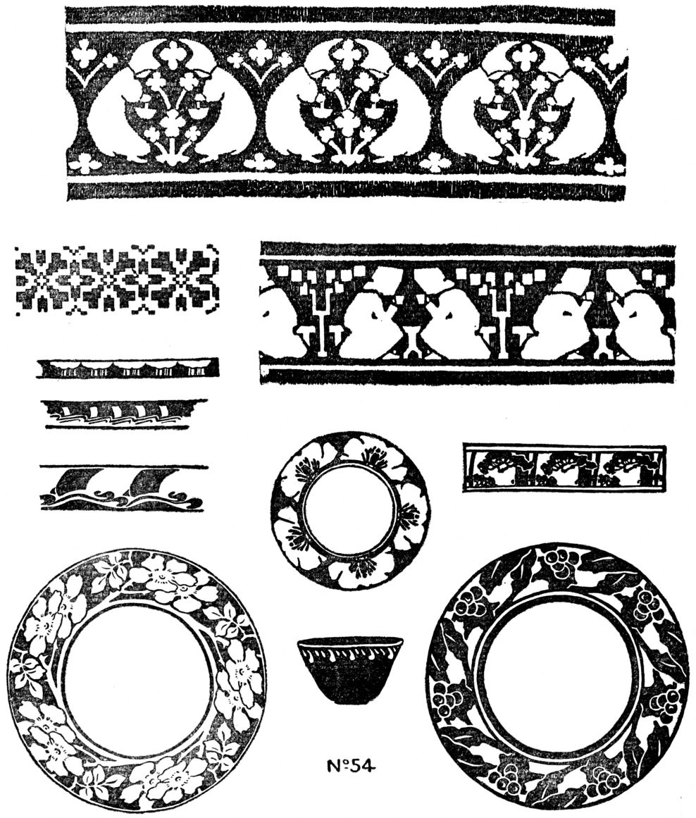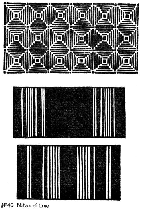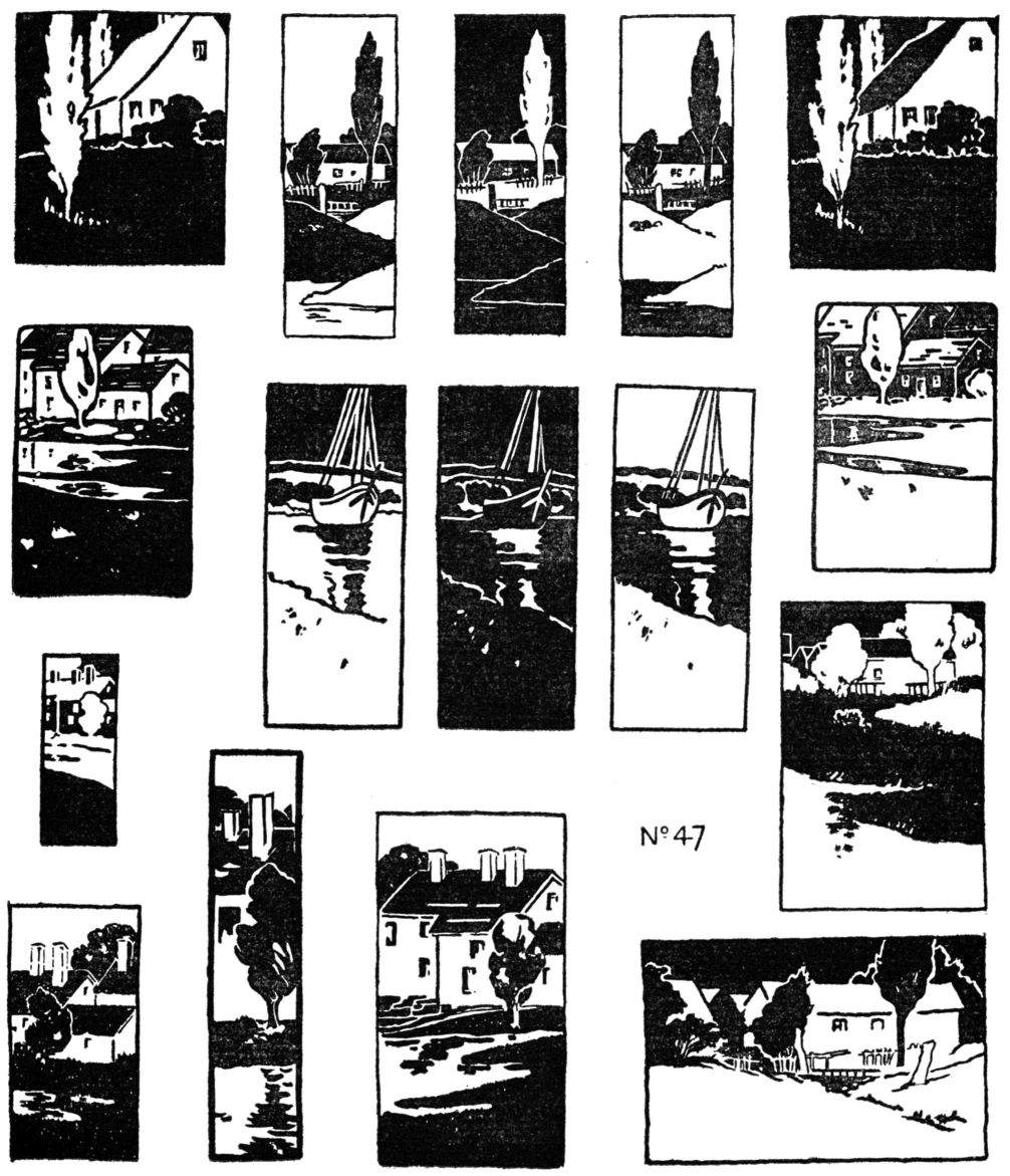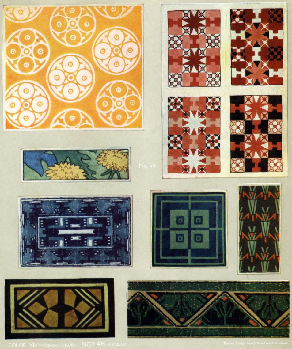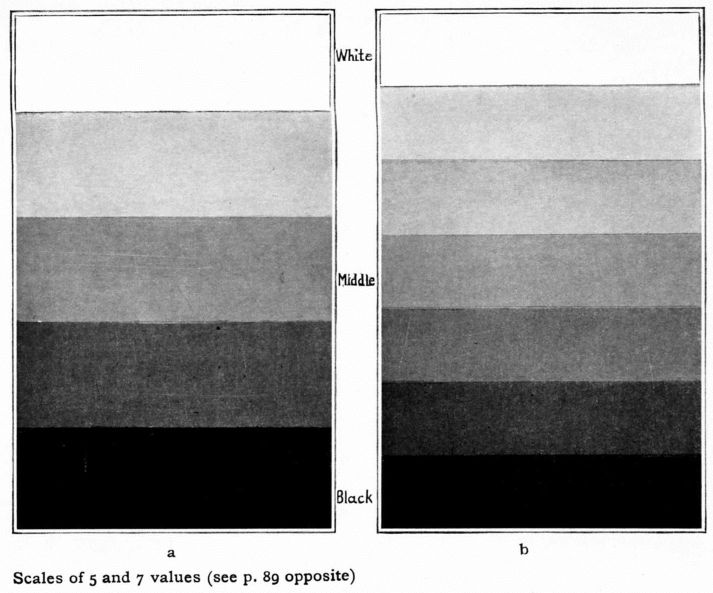 [pg 103] [pg 104] [pg 105] [pg 106] [pg 107] [pg 108] [pg 109]More applications can be made than in the case of Hue; historic art is full of them. Dutch tiles, Japanese prints and blue towels, Abruzzi towels, American blue quilts, etc., are examples of harmony built up with several values of one hue. With two hues innumerable variations are possible. Japanese prints of the “red and green” period are compositions in light yellow-red, middle green, black, and white. Other examples can be easily found in the world's art. The student should apply the scale-notes to his own designs, not using, at this stage, more than two hues, with perhaps black and white.
