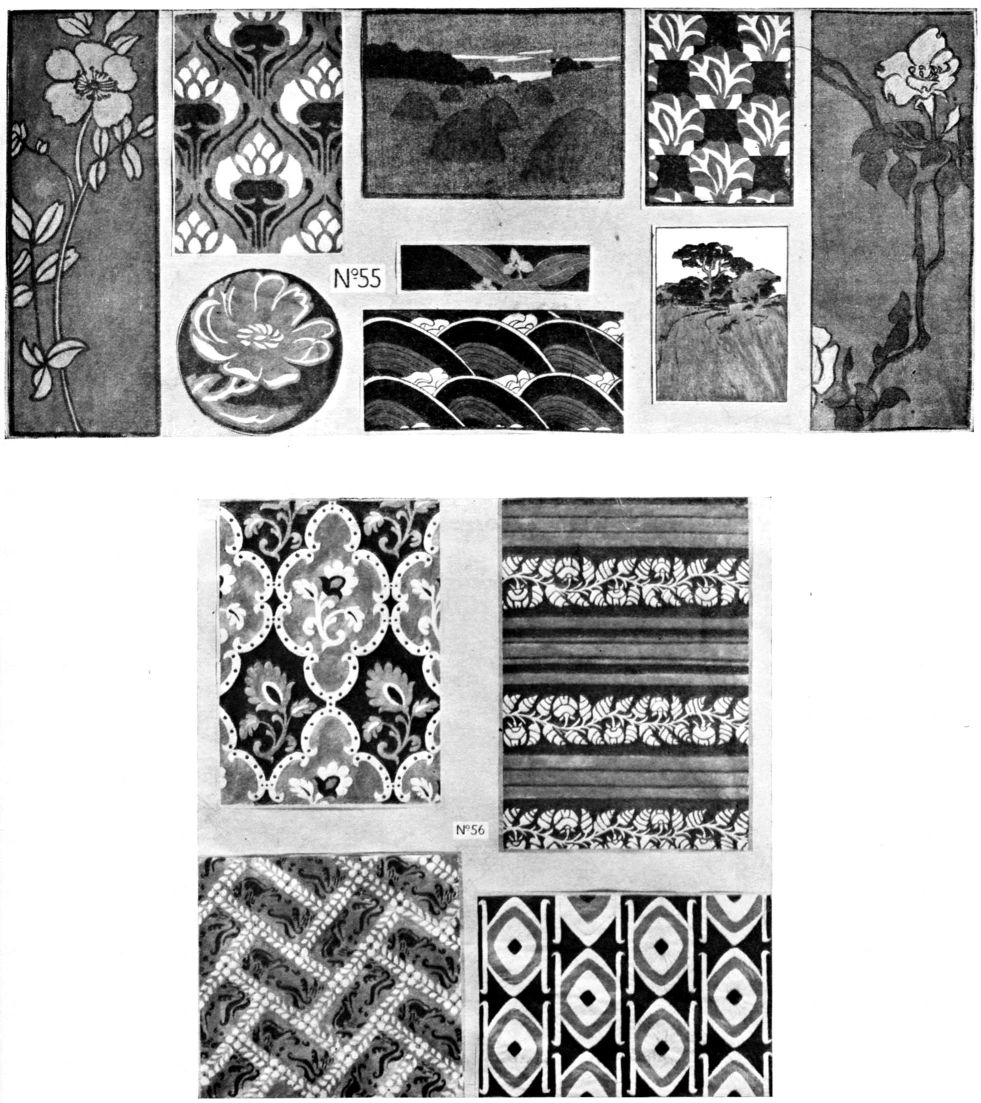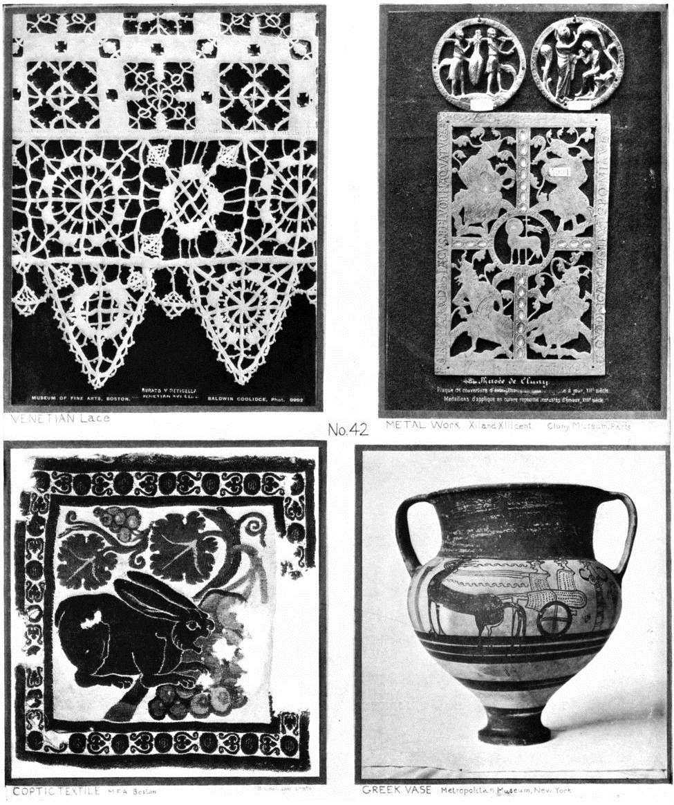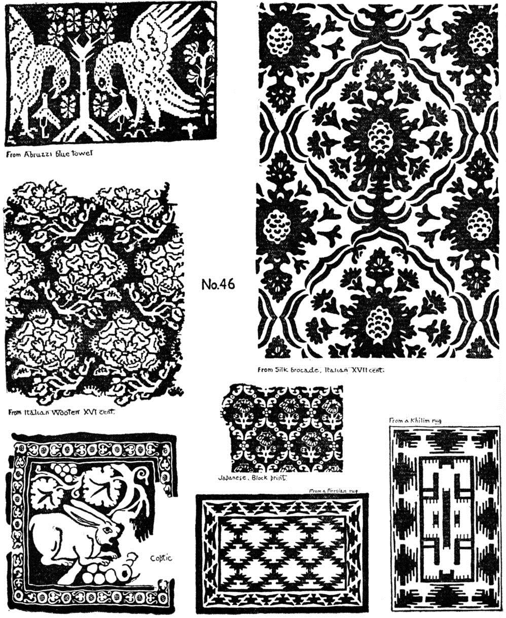 As to models, work from originals in museums,—Persian carpets and rugs, Coptic and Peruvian tapestries, mediaeval tapestries, Italian, Spanish and French textiles XIIIth to XVIIIth centuries, etc. In the “rag-fairs” of Europe, and in antique shops, one may find scraps of the woven and printed stuffs of the best periods. The South Kensington Museum has published colored reproductions of textiles. Art libraries will have Fischbach's, Mumford's, the Kelekian Collection and others in full color.