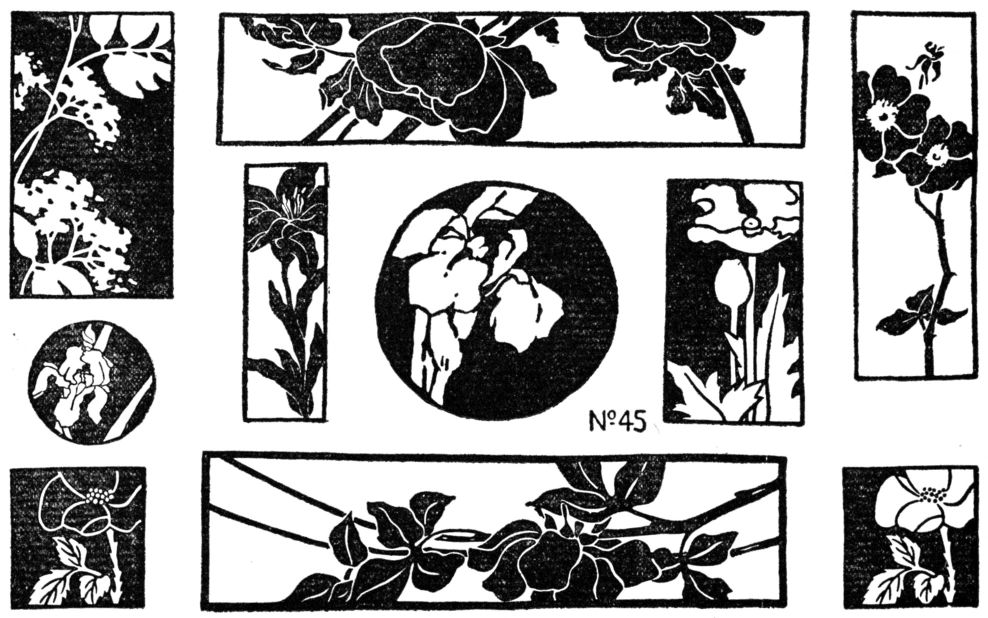 Stencil units are usually large, offering good opportunities for Subordination (page 23), Symmetry, and Proportion (page 28). A unit must not only be complete in itself but must harmonize with itself in Repetition (pp. 36, 66). Stencils may be cut upon thick manila paper which is then coated with shellac; or upon oiled paper. If stencil brushes cannot be obtained one may use a common, round, house-painter's brush, wound with string to within an inch of the end.