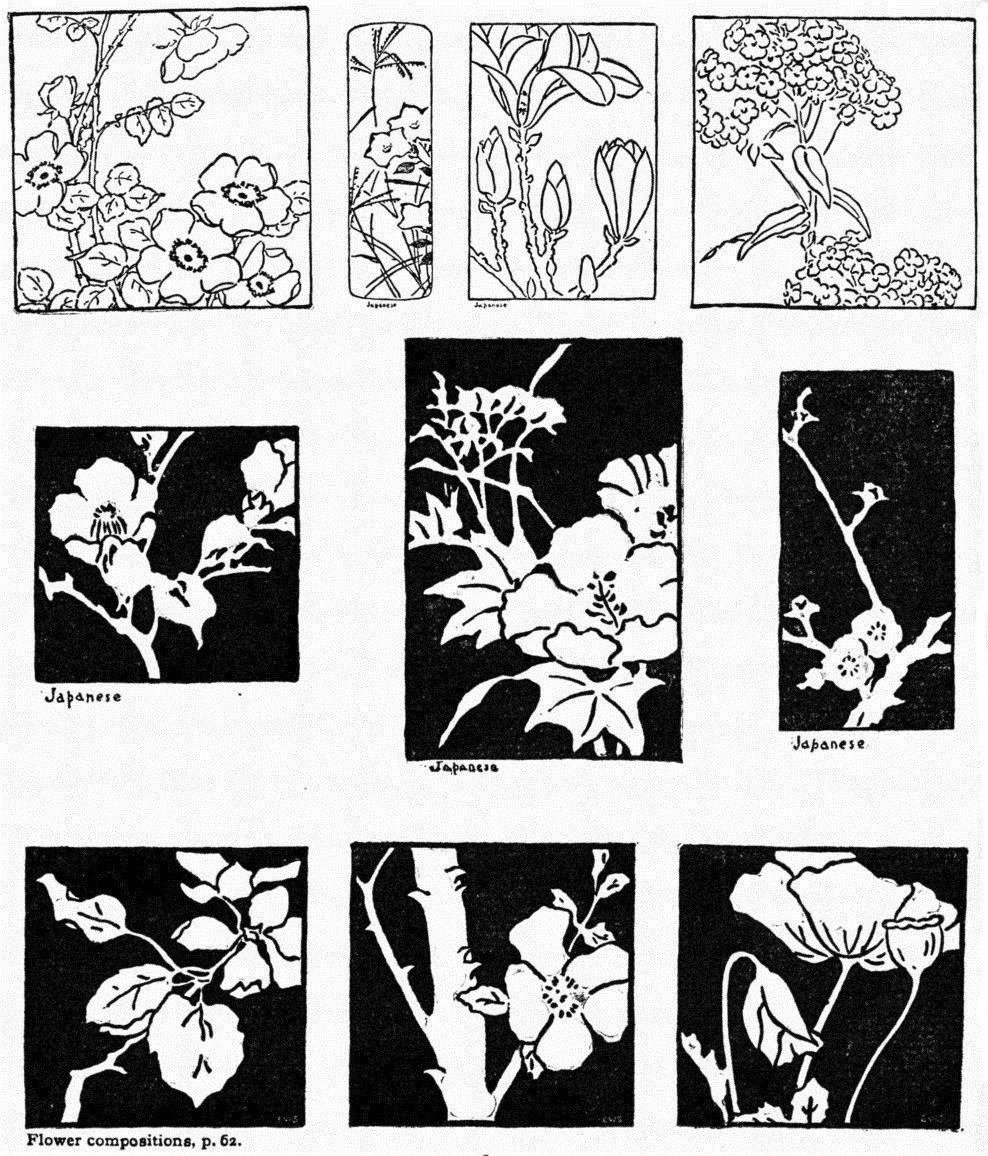 [pg 35]Never try to erase an ink line,—if a mistake occurs begin again. Tracing, for the art-purpose of improving proportions and acquiring an expressive brush-touch, is a most valuable help to the production of good work. Architects use tracing-paper for changes in plans. Japanese artists trace again and again until satisfied with the quality of touch and strength of drawing. Straight line is chosen for elementary practice because of its simplicity, and because it prepares for work with curves. The finest curve is measured by a series of straight lines in harmonic relations of rhythm and proportion (p. 42). After some experience with straight line, cut areas with curved,—geometric, flower, fruit, landscape or figure.