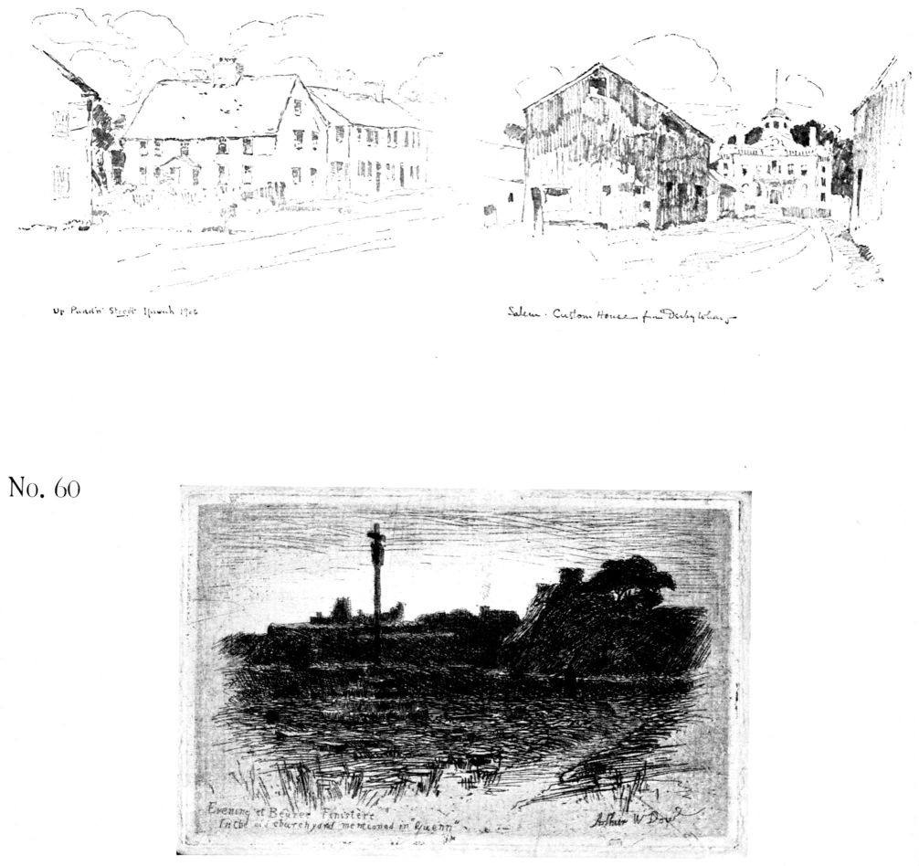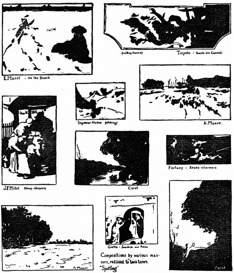 Etchers and lithographers often add a few touches of color not only as a contrast to the grays, but to cause the beholder to imagine the whole color-scheme. The effect of modifying neutrals with hue may be observed in the following