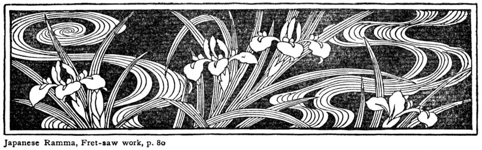 Dry colors mixed with water and a little mucilage, or better still, common water colors, may be used. No. 69 is a reproduction of a print made in the Japanese way. (In 1895 I exhibited at the Boston Museum of Fine Arts a collection of my wood block prints. Professor Fenollosa wrote the introduction to the catalogue, discussing the possibilities, for color and design, of this method, then new to America. In “Modern Art” for July, 1896, I described the process in full, with illustrations, one in color.)