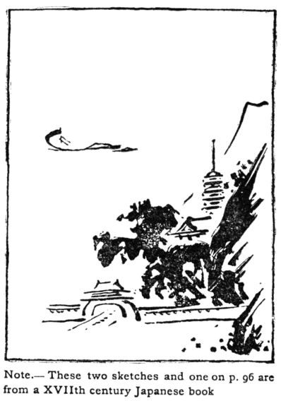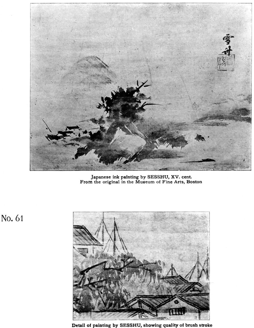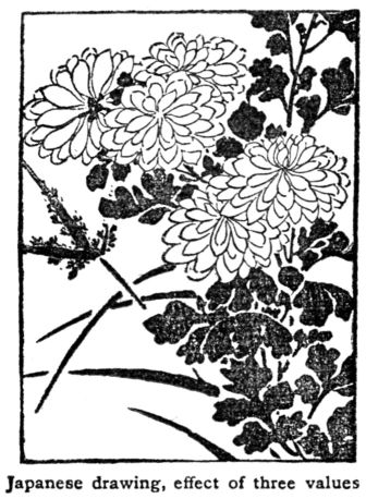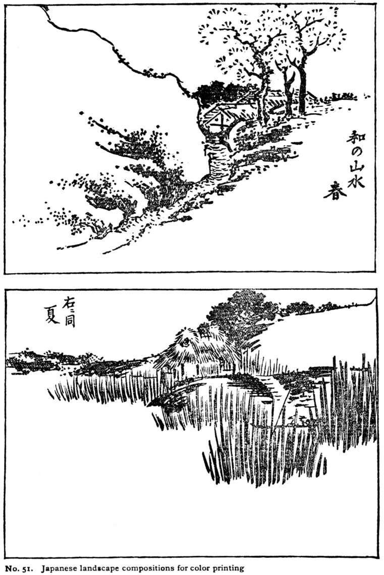 [pg 111] [pg 112]One approach to Color may be through Notan, either before or after studying color theory. By clustering lines tone is produced (page 54); by tingeing neutral grays Color is produced. In monochrome itself fine relations of notan will suggest color. Japanese ink painters enhance the harmonies of tone-composition by mingling slight quantities of hue with the ink. Faint washes of yellow in foregrounds, of green in foliage, of blue in sea and sky, of red and other colors in buildings and costumes, convey impressions of full color-keys.