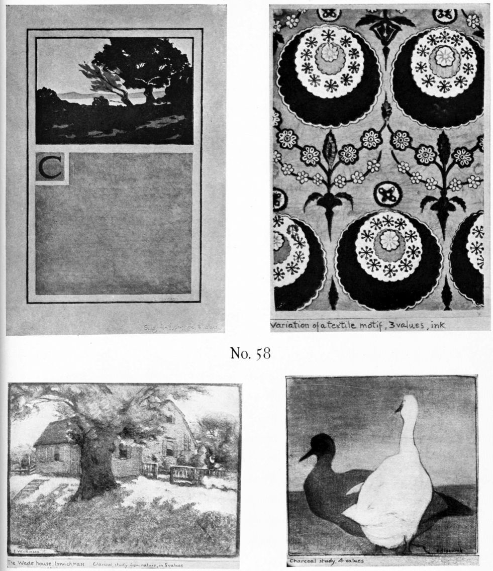 Study of composition of Line, Mass and Color leads to appreciation of all forms of art and of the beauty of nature. Drawing of natural objects then becomes a language of expression. They are drawn because they are beautiful or because they are to be used in some art work. Facility in drawing will come more quickly in this way than by a dull routine of imitation with no definite end in view.