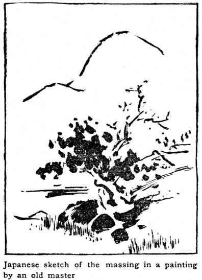 Copies from Hiroshige are of special value to the landscape painter. These may be made in oil as a study of quality and vibration. The procedure is a little different from the preceding. It is better, in oil painting, to copy whole prints. Over the surface of a large rough canvas scrub a thin gray, of the color of the paper of the print. Draw the design in a few vigorous lines, omitting all details. Paint in, at arm's length, the principal color notes, not covering the whole surface or filling in outlines. Mix colors beforehand, taking time to copy each hue and value exactly. The painting, with each color ready upon the palette, should be swift and vigorous. Place the print above the canvas; stand while painting; make comparisons at a distance.