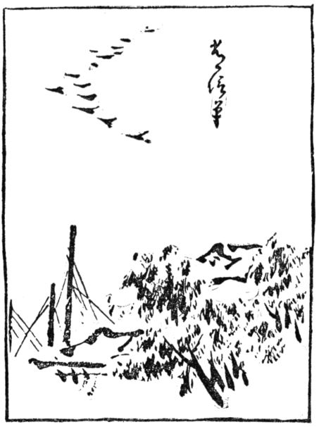 Among XLXth century men Hiroshige (page 13) and Hokusai are preëminent [pg 118] as colorists. Both have strongly influenced Occidental painters. Hiroshige designed series after series of prints,—scenes famous for their beauty or historic interest; stations on the two great highways, the Tokaido and the Kisokaido; effects of wind, rain, snow and twilight; flowers, birds, and a few figures. He would recompose the same series again and again in different size and color-scheme. His design is full of delightful surprises; his artistic power and inventiveness are astonishing. A prodigious amount of work is signed by his name; some critics hold that there was a second, and even a third Hiroshige, but Fenollosa believed in one only, whose manner naturally varied during a long life (1790—1858).