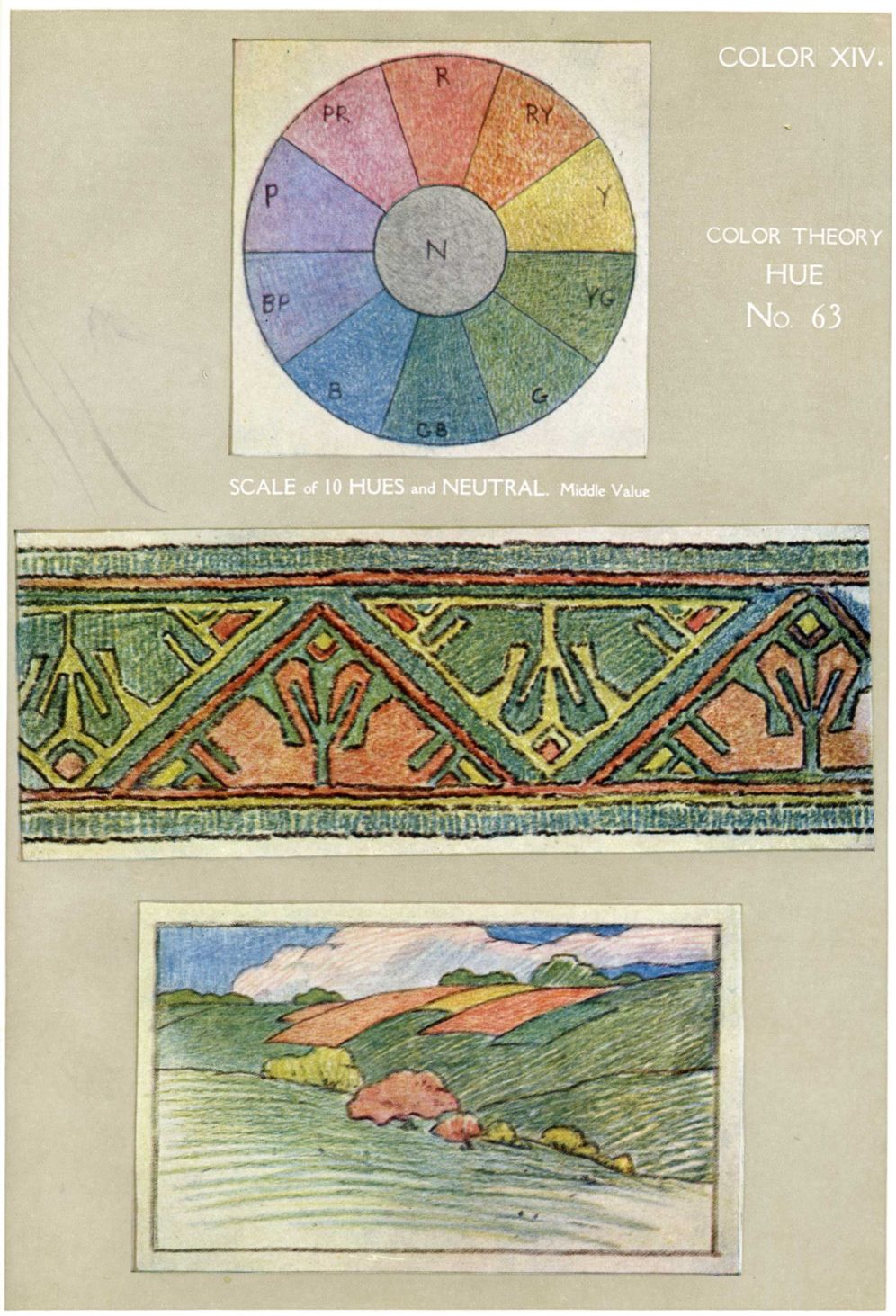 ONE HUE and NEUTRALS. Another approach to color, from notan, is through substitution of hues for grays. This might (in a short course) follow exercises in five or more values (page 89.) Referring now to the scales of five and seven values, for application to a design, [pg 114] substitute a hue for one of these grays, carefully keeping the value. If the subject be a variation of a Coptic textile, a warm red or yellow-green may be chosen; for a flower panel, bright yellow, yellow-red or emerald green. Excellence in result will depend upon distribution of the one hue among neutral tones.