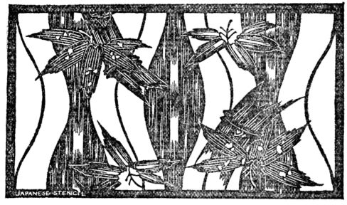 STENCILLING, like wood block printing, invites variation of rhythm and color combination. Stencilling is often done without sufficient knowledge of the craft. The student should understand that a stencil is simply a piece of perforated water proof paper or metal to be laid upon paper or cloth and scrubbed over with a thick brush charged with color; long openings must be bridged with “ties,” and all openings must be so shaped that their edges will remain flat when the brush passes over them.