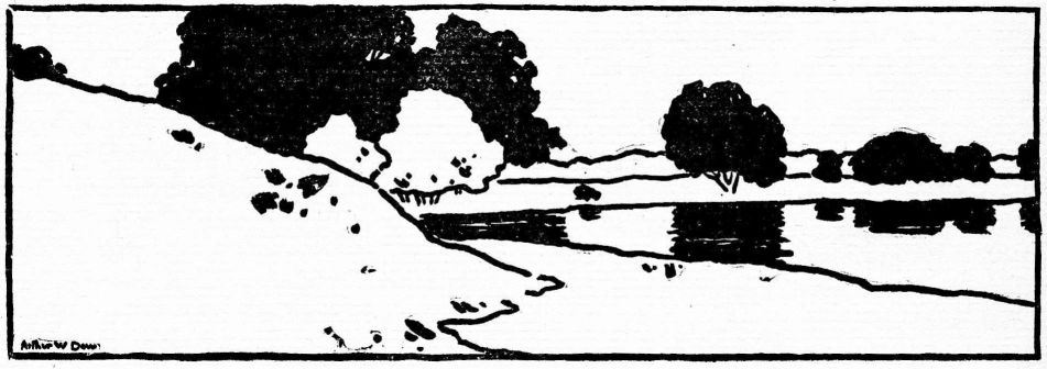PICTURE PRINTING is a more difficult, but fascinating form of this art-craft. Here must be gradation, transparent and vibrating color, atmospheric over-tone binding all together. For these qualities the Japanese process is best, with its perfected tools and methods. In theory it is very simple: The outline is drawn in ink upon thin paper, and the sheet pasted face down upon the flat side of a board; the block is then engraved with a knife and gouges, the drawing being left in relief; the paper is removed from the lines with a damp cloth, and the block charged with ink. Dry black mixed with mucilage and water, or any black water color will answer. For charging, the Japanese use a thick short brush,—a round bristle brush will serve the purpose. When ink is scrubbed evenly over the whole surface, the block is ready for printing. A sheet of Japanese paper, slightly [pg 126] dampened, is laid upon the block and rubbed gently with a circular pad called a “baren.” This wonderful instrument draws the ink up into the paper, giving a clear rich soft line. The baren is made of a leaf of bamboo stretched over a saucer-like disk of pasteboard, within which is coiled a braided fibre-mat.